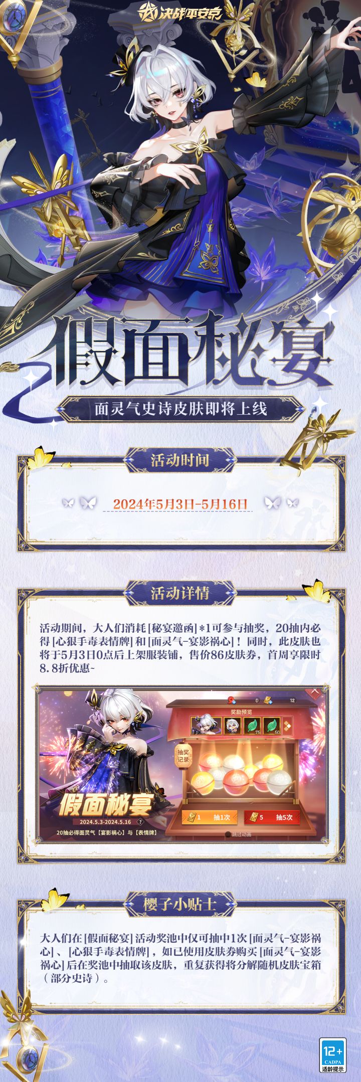 5月3日0点起,面灵气全新史诗皮肤「宴影祸心」即将上架服装铺,售价86皮肤券,首周享限时8.8折优惠!此外,大人们还可消耗[秘宴邀函]*1参与假面秘宴活动抽奖,20抽内必得面灵气全新史诗皮肤「宴影祸心」与[心狠手毒表情牌]~