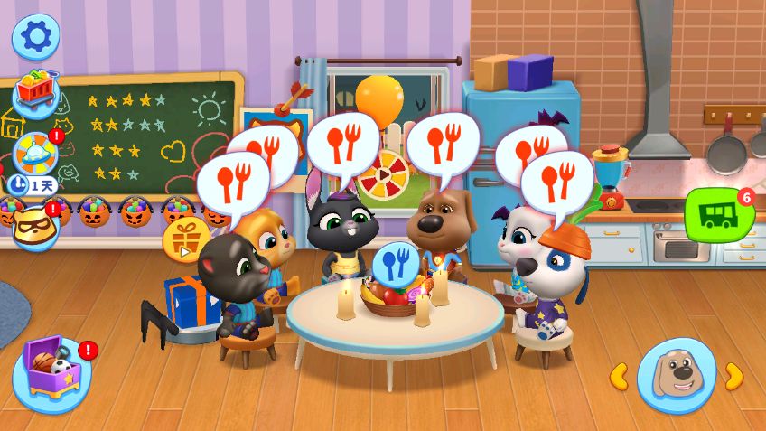 当然六只宠物食量还是非常大的,那么我们应该如何保证宠物的三餐呢?我们日常的食材可以在冰箱购买,当然,缺乏食物的时候也可以点击餐桌,观看一段小视频获得。除此之外,户外郊游也可以获得一些精美的食物。多多积累巴士币以及金币,给汤姆猫家族带来丰富美味的食物吧!