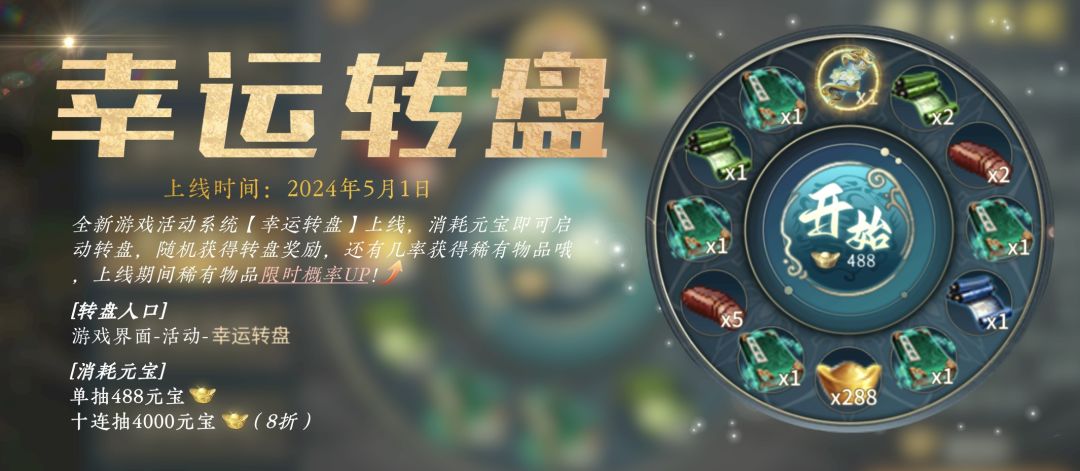 活动详情:活动期间开启限时<幸运转盘>,保底奖励为新特技书<将技·花语灵卷>,更有两轮部分道具概率限时上调,时间有限,好汉切莫错过!