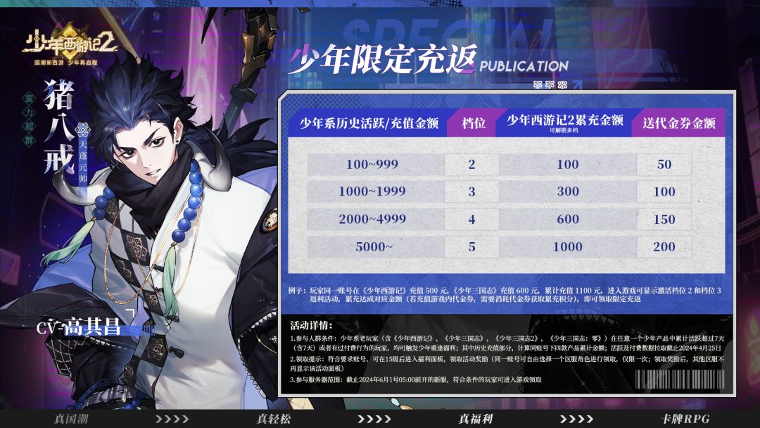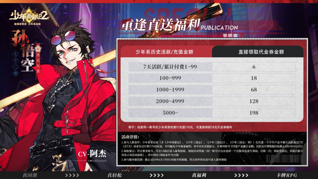 1.参与人群条件:少年系老玩家(含《少年西游记》、《少年三国志》,《少年三国志2》,《少年三国志:零》)在任意一个少年产品中累计活跃超过7天(含7天)或者有过付费行为的玩家,均可触发少年重逢福利;其中历史充值部分,计算同账号下四款产品累计金额;活跃及付费数据拉取截止2024年4月25日。