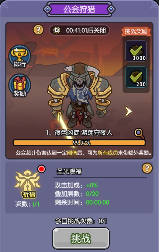 4、在活动界面可通过祈福获得增益效果,最多可叠加20层,每位成员每天只能祈福1次。每次祈福增益时间持续3小时,不同成员祈福后,增益效果持续时间重置,城主可以选择等待祈福效果更高后再狩猎怪物哦;