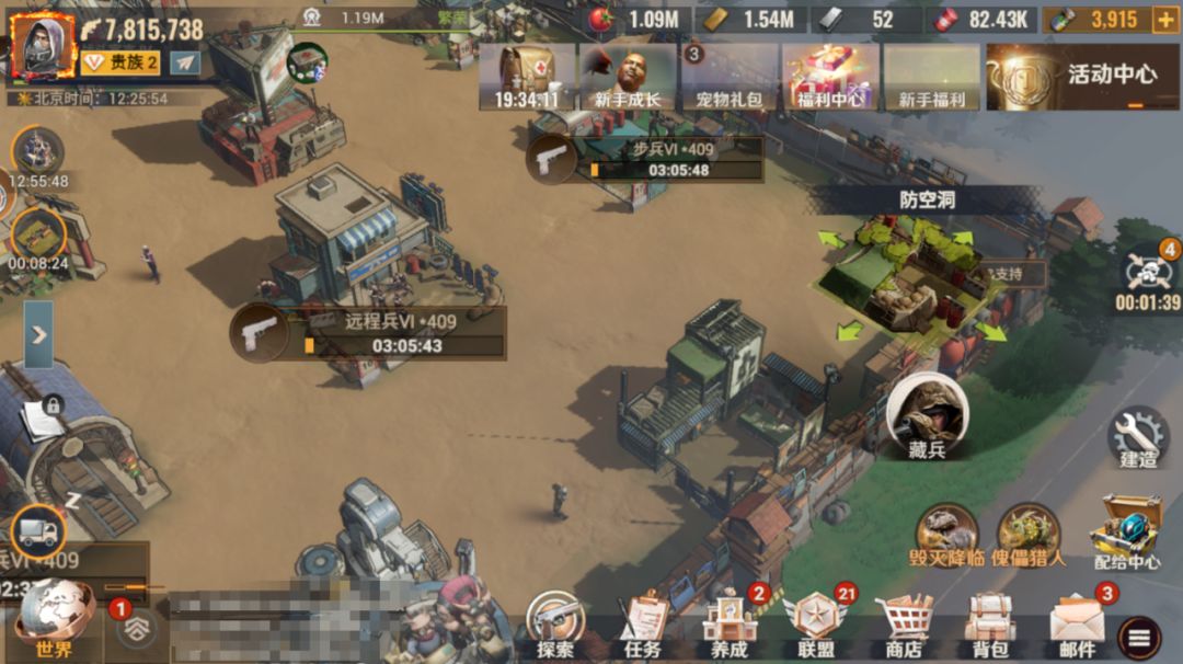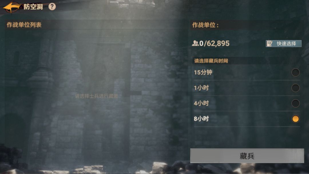 3、藏兵这是一个大家比较少会用到的功能,在基地内一个叫做防空洞的建筑。防空洞内可以藏下一整支作战部队,只要你的队伍行军容量够高,甚至前期如果你的行军容量能带走你所有造的兵,那么防空洞就可以藏下你所有的兵。