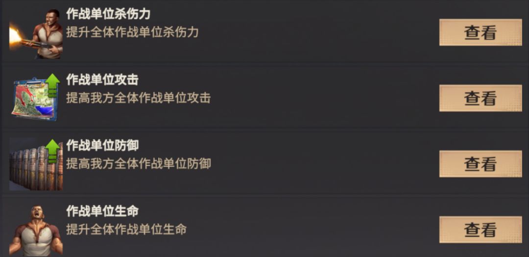 如进攻向的【作战单位杀伤力】【作战单位攻击】【作战单位防御】【作战单位生命】以及【行军容量】。集结进攻目标时,如果你是车头,有必要再开一个【集结容量】,增加集结部队的容量,让更多人能加入作战,造成的伤害也会更高。