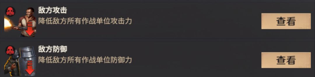 如果是防御对手进攻,可以选择开启【敌方攻击】和【敌方防御】,降低敌方所有作战单位的攻击和防御,减少自己的损失。