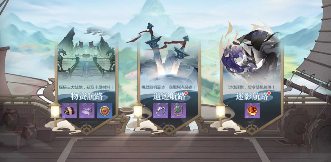 探索系统共分为“物资航路、遗迹航路、迷影航路”三个玩法: