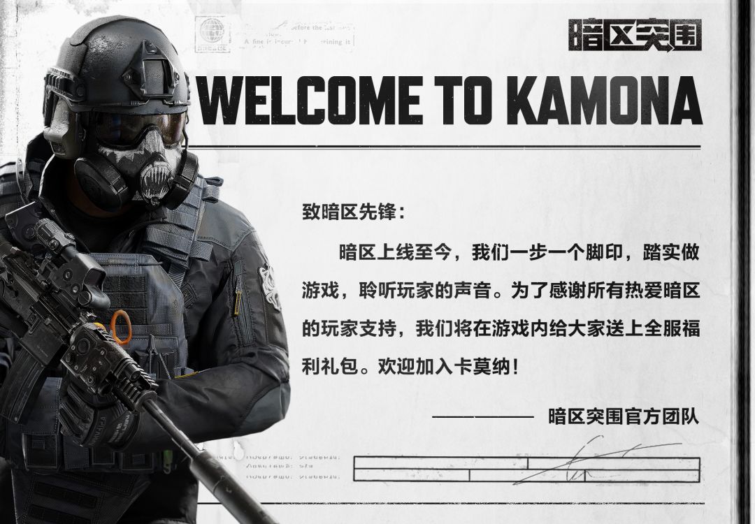 Welcome to Kamona!感谢大家一直以来的支持与鼓励,暗区突围以最真挚的诚意,邀请各位先锋加入卡莫纳,尽情体验这充满未知危险的战场魅力!为此我们将送上以下祝福: