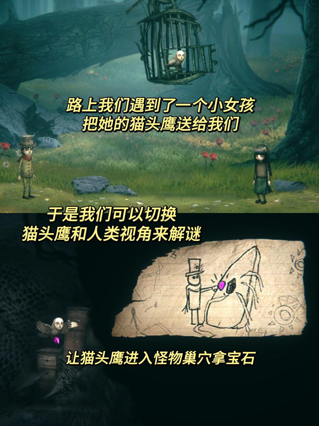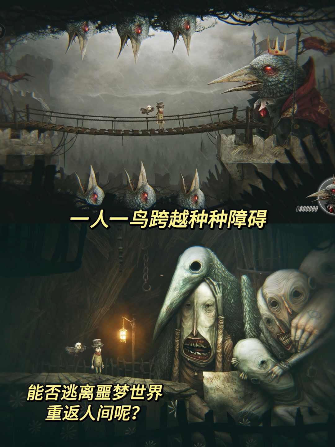 游戏里我们扮演的是一个生命垂危的小男孩,濒死时进入噩梦世界,依靠和妹妹的羁绊以及她的猫头鹰指引,逃出这个无尽的噩梦!