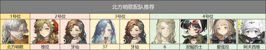 配队思路北方哨歌主要定位为精神爆发主C,能与维拉组队是最好的,牙仙也是不错的选择,剩余的队友挑选牌权少的辅助、副C最好或与37组双C队(大招后,发射的1技能属于额外行动),如6,泥鯭的士等。