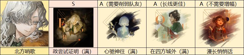 优先选择北方哨歌的专武——故尝试证明,其次选择满增幅的心驰神往或在四方城外(推荐长线),不增幅下可以选择漫长悄悄话