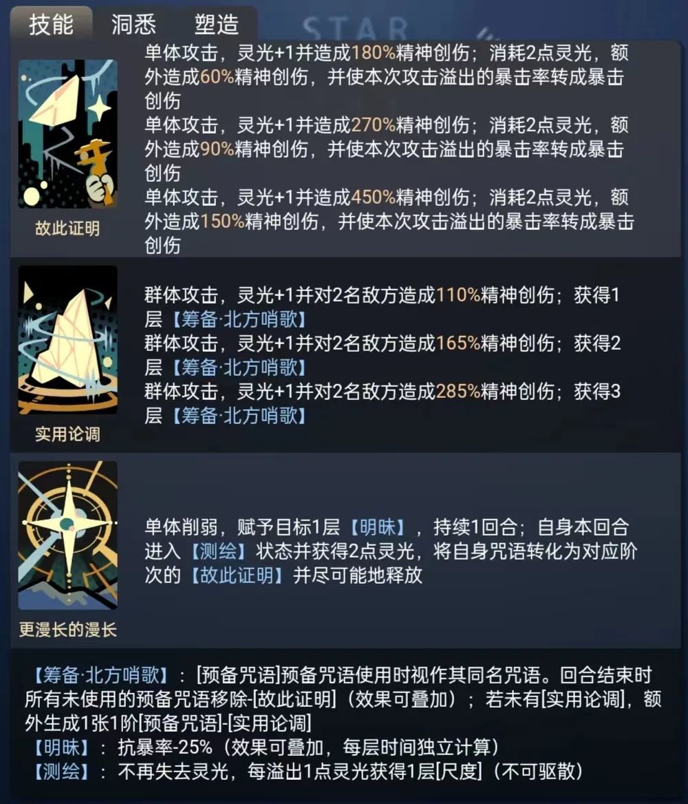 北方哨歌是一名星系暴击爆发型角色。己方触发暴击或赋予的【明昧】都能使她提升自身的暴击输出能力。通过合理的运用筹备咒语效果,北方哨歌能持有较多数量的咒语,并释放至终的仪式时无行动消耗地实现高频次爆发。