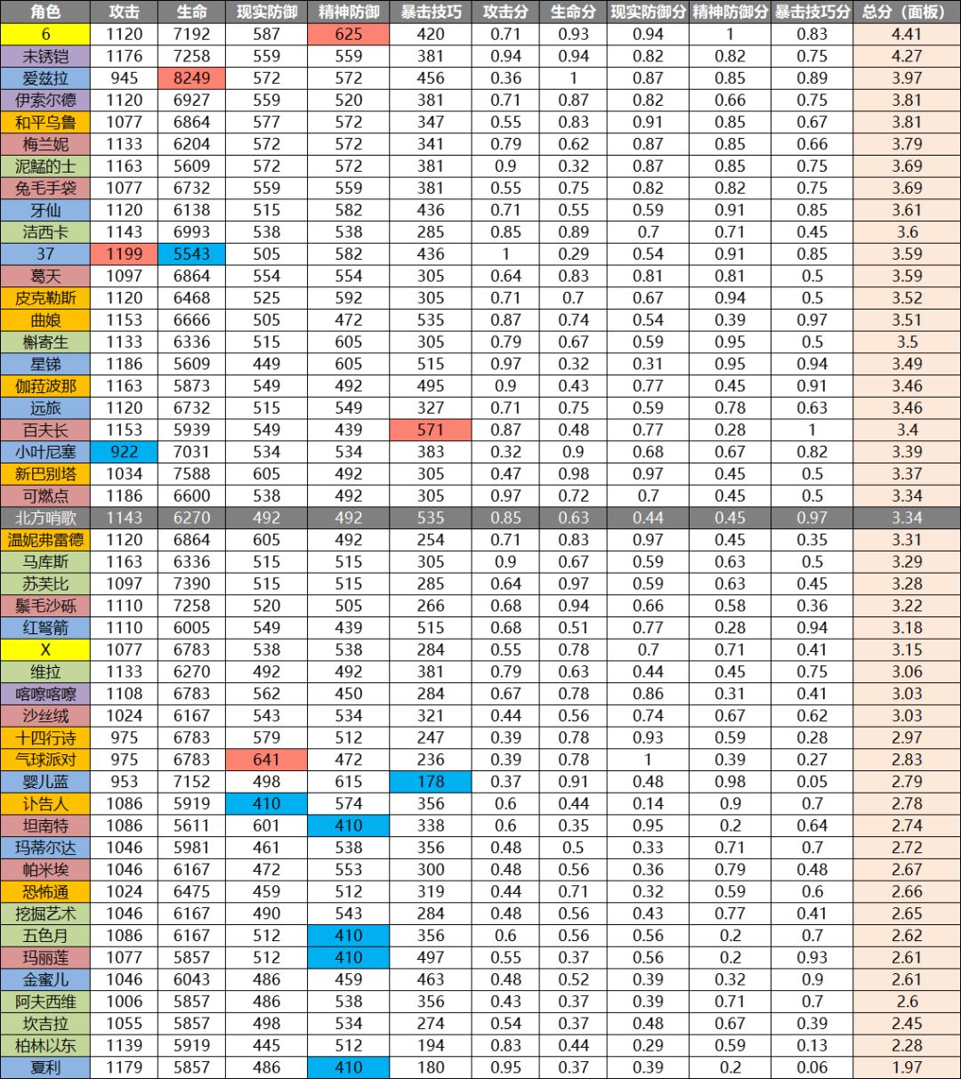 关于面板:北方哨歌的攻击中等偏上,暴击技巧名列前茅,但自身坦度较差,典型的输出面板,整体面板居中。