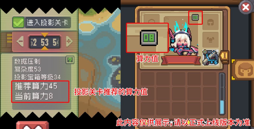 小骑士身上的算力值会影响在投影关卡中对数据压制的解析进度,算力越高,解析速度越快,投影关卡的选择界面会有推荐算力供小骑士参考,小骑士在进入投影关卡前要查看推荐算力,做好准备再挑战哦!