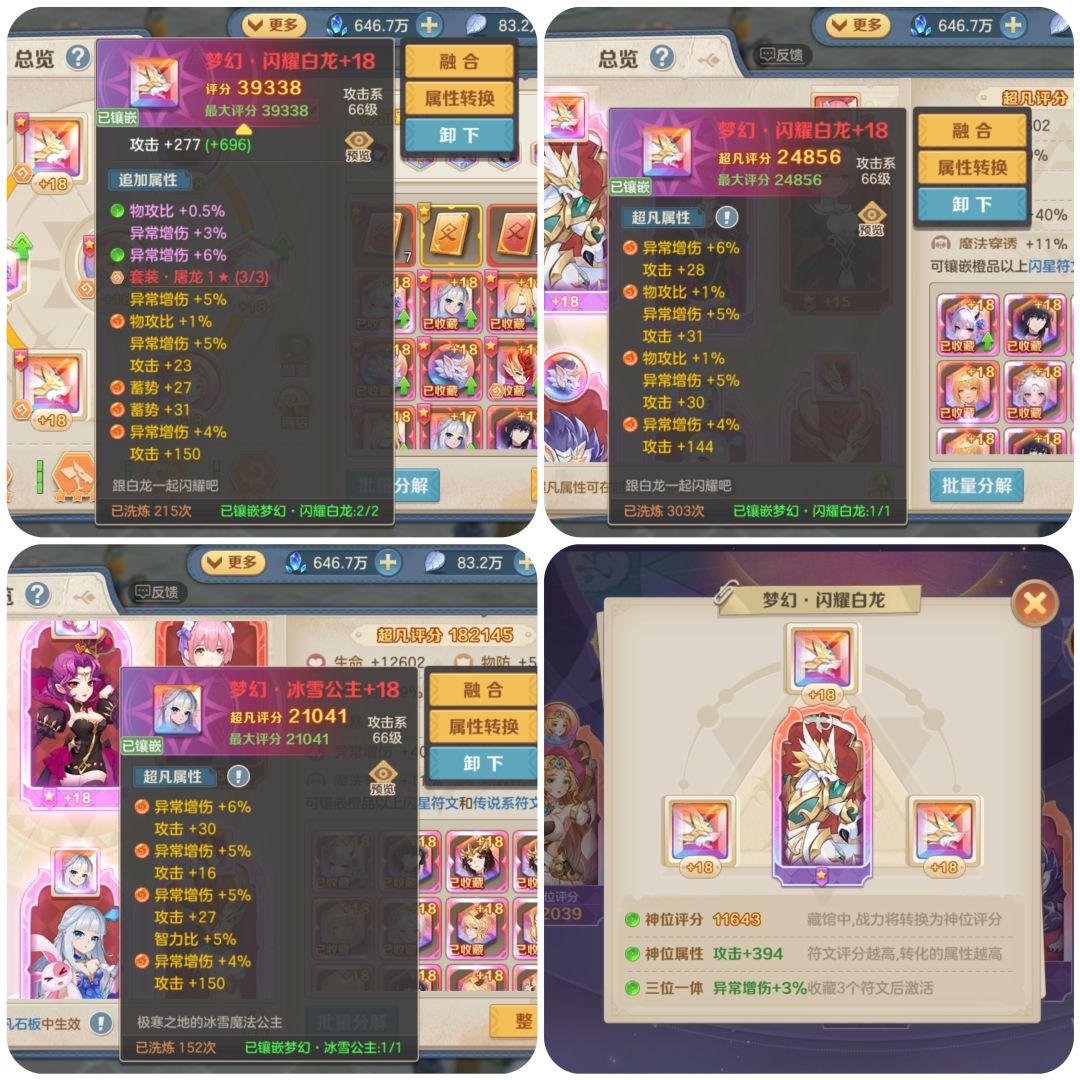 异常最大的来源主要是符文,物理系闪耀白龙和法系冰雪公主是异常的核心符文,梦幻神位的三位一体也能增加3%异常,如果你主堆异常伤害,做符文的时候第一时间要把闪耀白龙和冰雪公主属性洗毕业,然后梦幻开强化18。