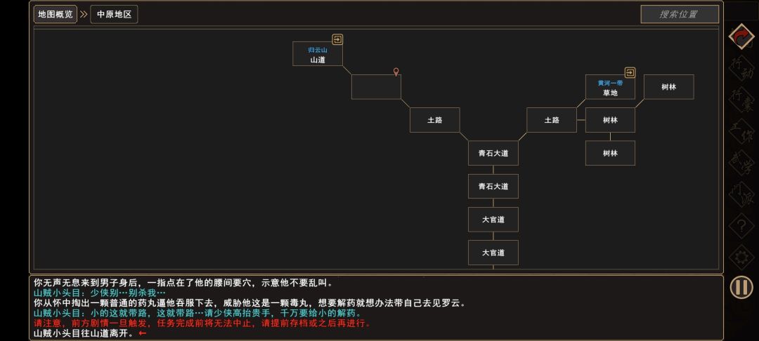 (1)前往 中原地区→山道(归云山),触发过场剧情(任务剧情开启后无法退出,建议提前保存)。