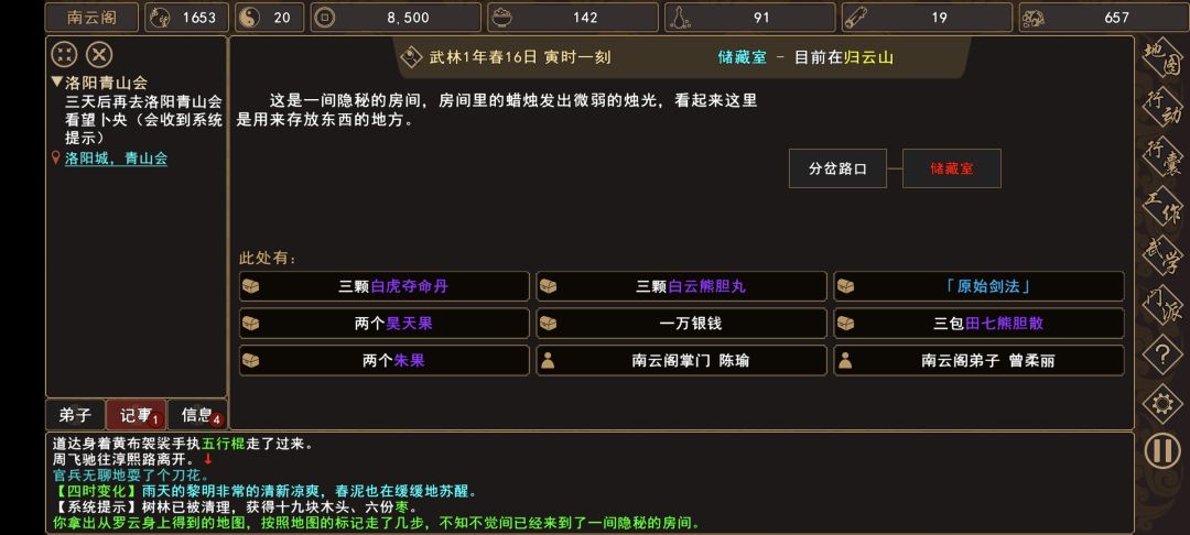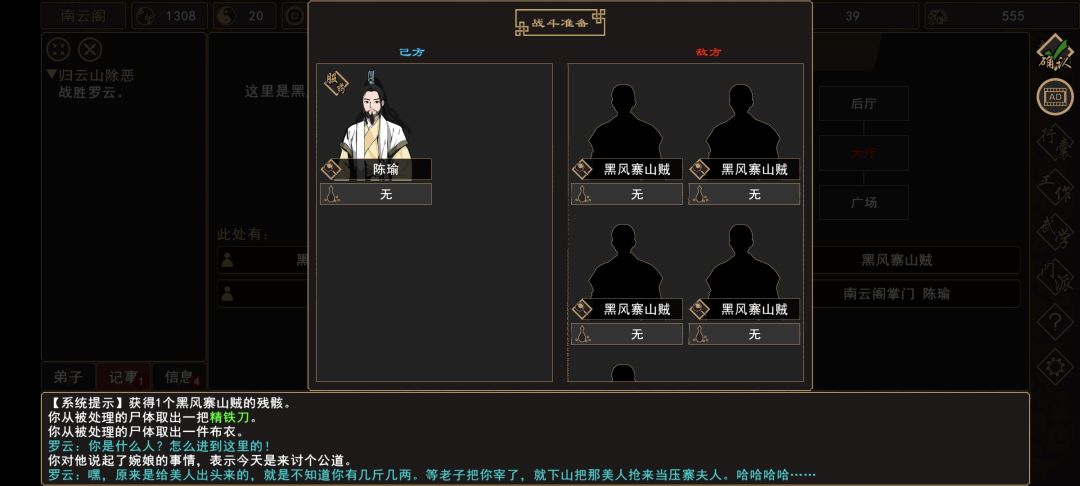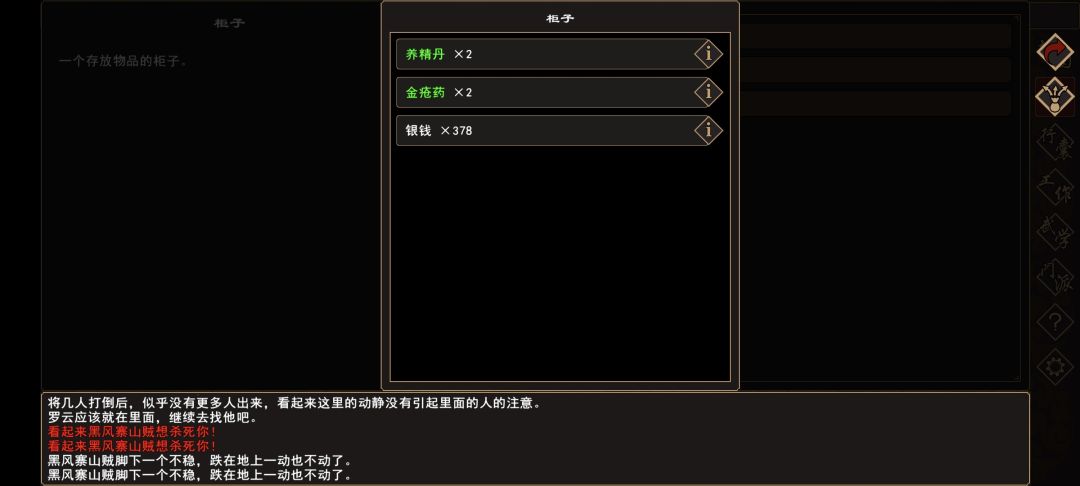 (4)前往 归云山→大厅,触发战斗(归云山→厢房,触发战斗,柜子内可获得少量伤药)。