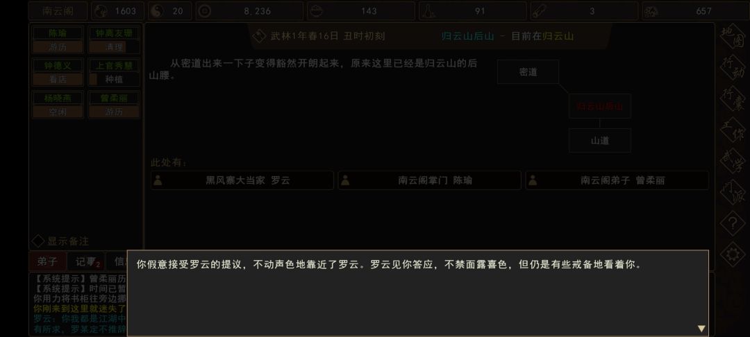 (6)通过密道前往 归云山→归云山后山,触发剧情分支:①“直接拒绝……”/②“假意接受……”(需要自身/队友300+社交)。