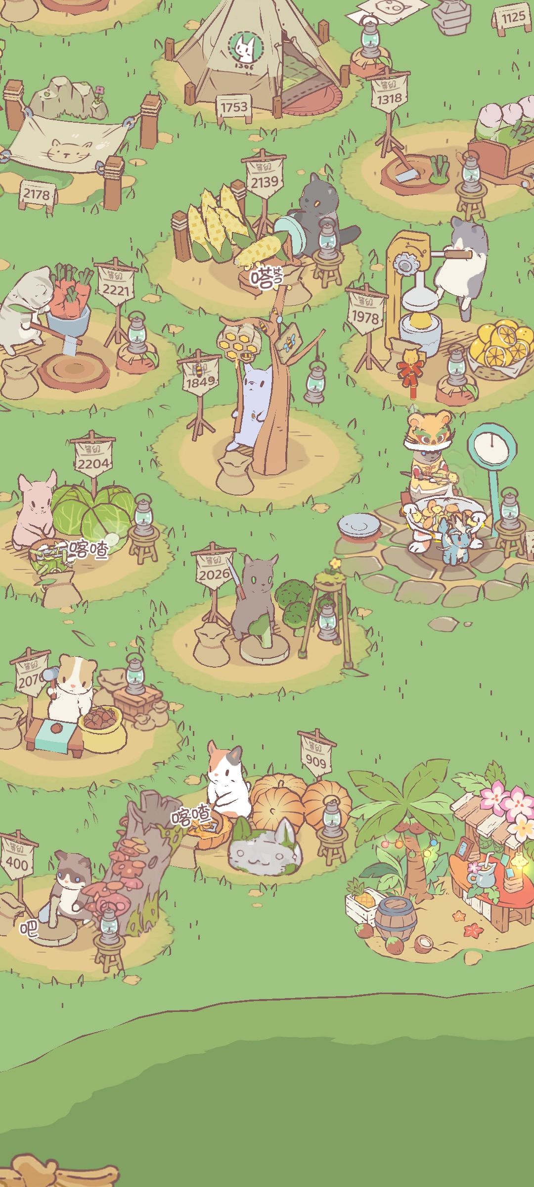 建筑全解锁了,等更新时间攒了很多钱,新建筑一上线,啪的一下站了起来,很快啊,一个摆在了熬汤旁边,一个摆在了果汁旁边,一个摆在了炒菜旁边,全摆好了,摆好了啊......
