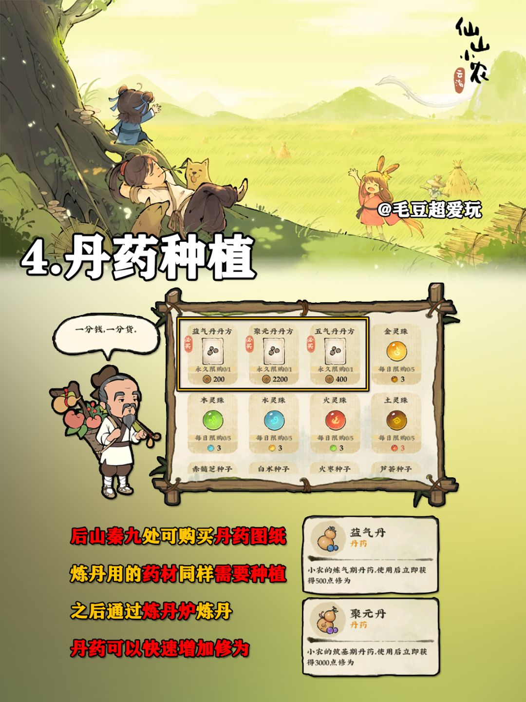 完成后山秦九的任务后解锁商店,可以购买丹药图纸和药材种子。