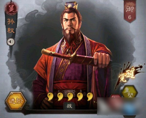 这个团队里孙权是比较难得的,他有个外号叫孙天王,虽然武力和智力不是很突出但他的属性却只要发动普通攻击就能被触发,而且不光是他自己,友军发动的也算,成功率有百分之七十五,属性里面破阵和连击是最有用的,因为持续输出的话伤害高。还有先攻的状态可以维持俩个回合;另外还有个洞察一共有4个属性。