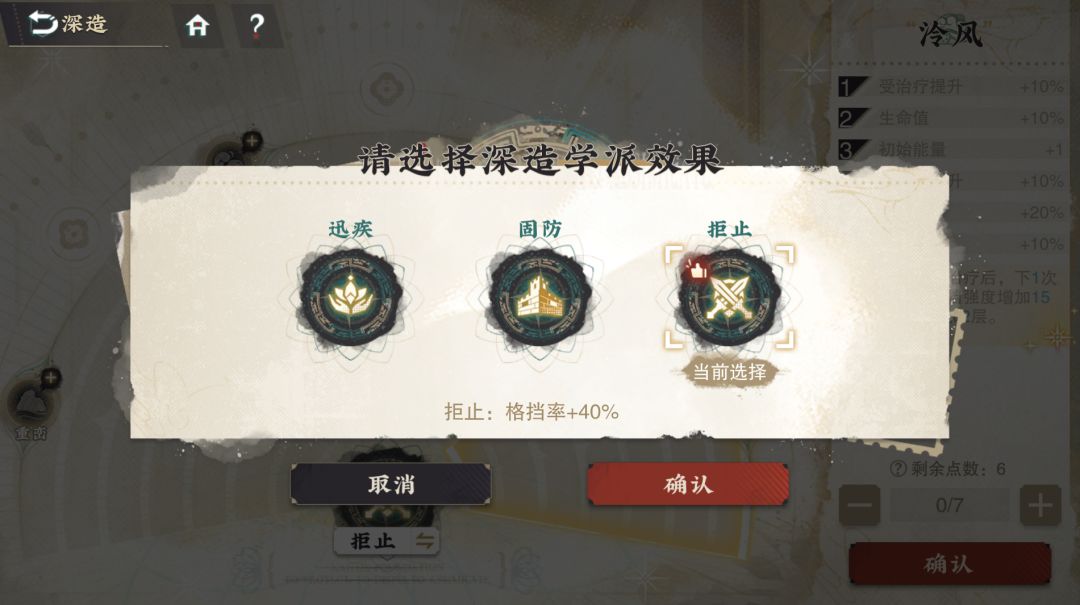 例如,吴王夫差矛的被动可以提升格挡率,那么选择深造选择拒止可以让她的格挡率更高。如果不知道怎么针对性选深造,宿卫可以优先选固防,全防御的增加怎么样都不会错,另外也可以选系统推荐的学派。