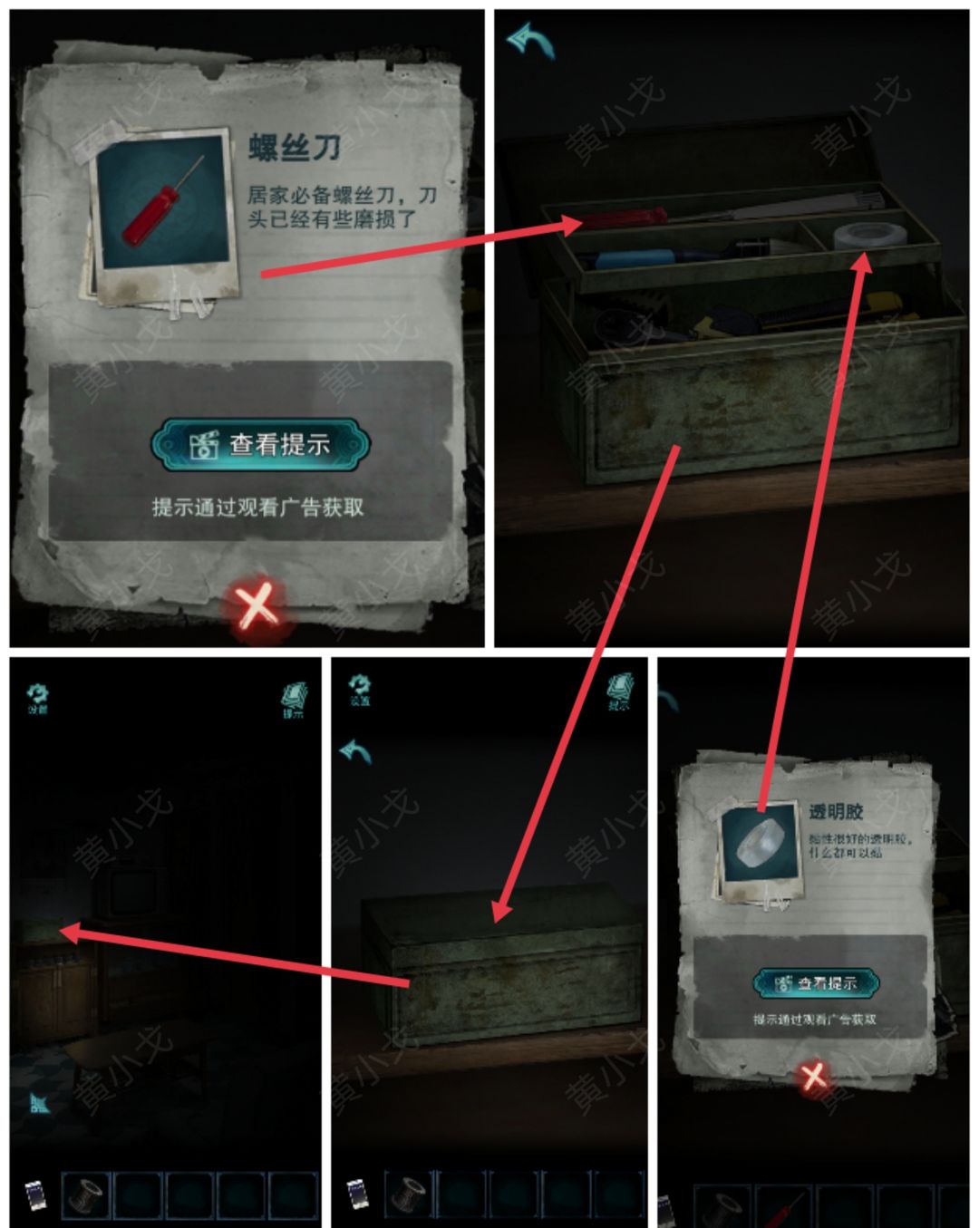 17.(404客厅)点击鞋柜上的工具箱,打开;获得【螺丝刀】和【透明胶】