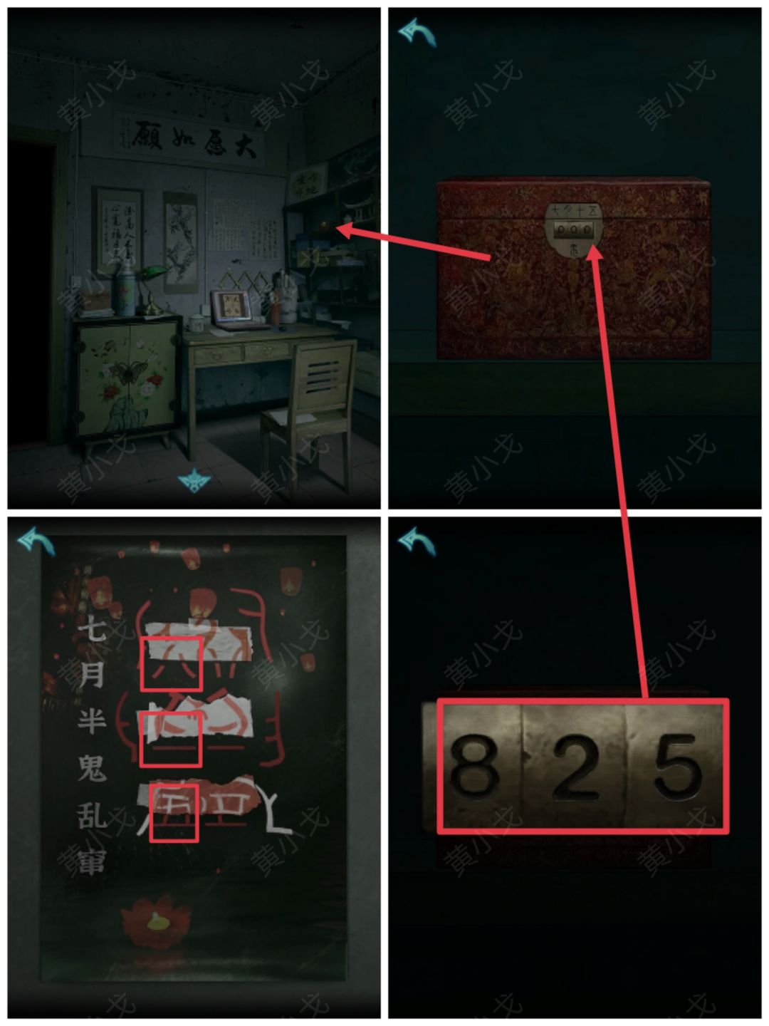 1.(401书房)点击架子上的盒子,根据海报上的线索( 八二五),输入密码:825