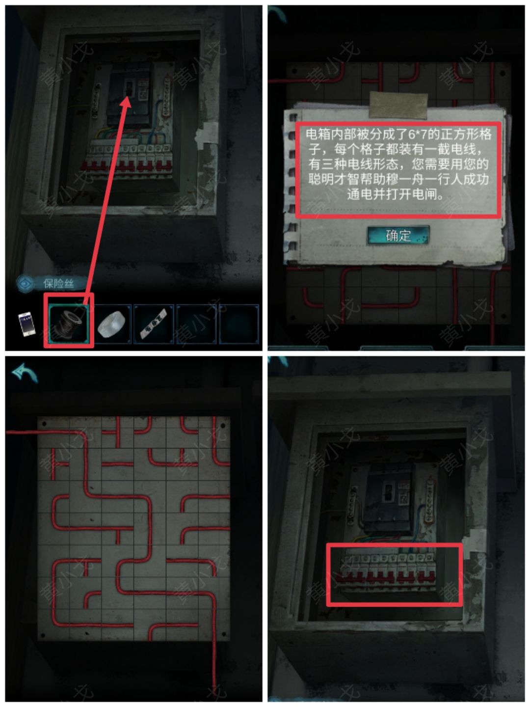 21.打开电箱,装上【保险丝】;查看游戏说明,完成小游戏;打上闸,通电