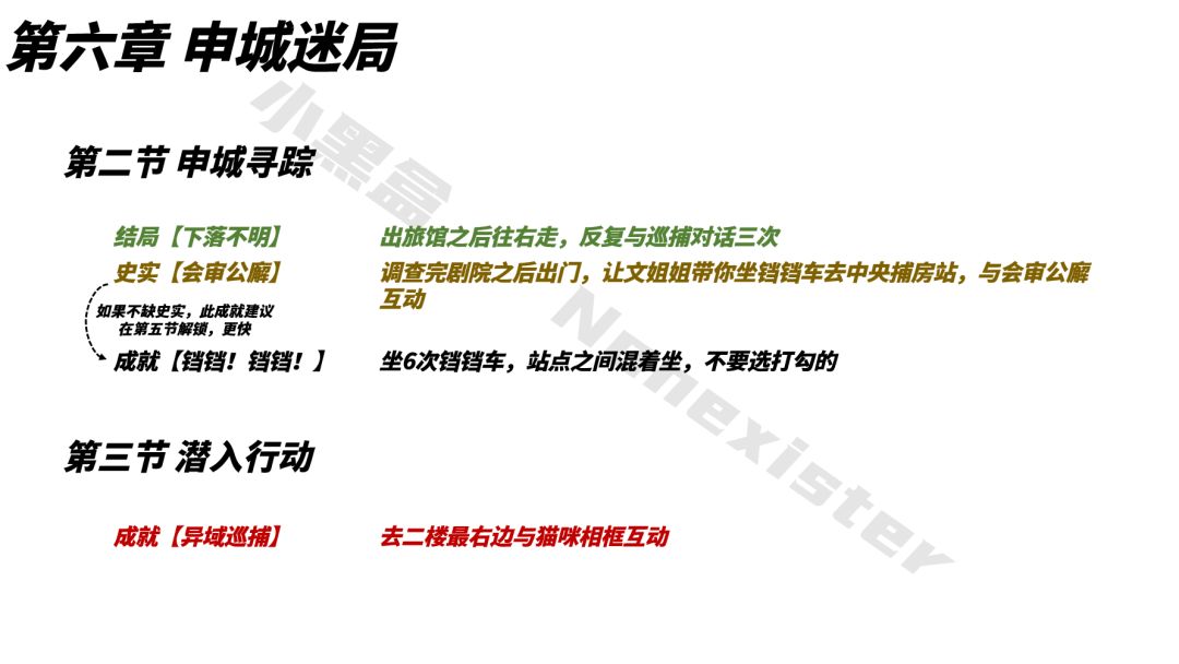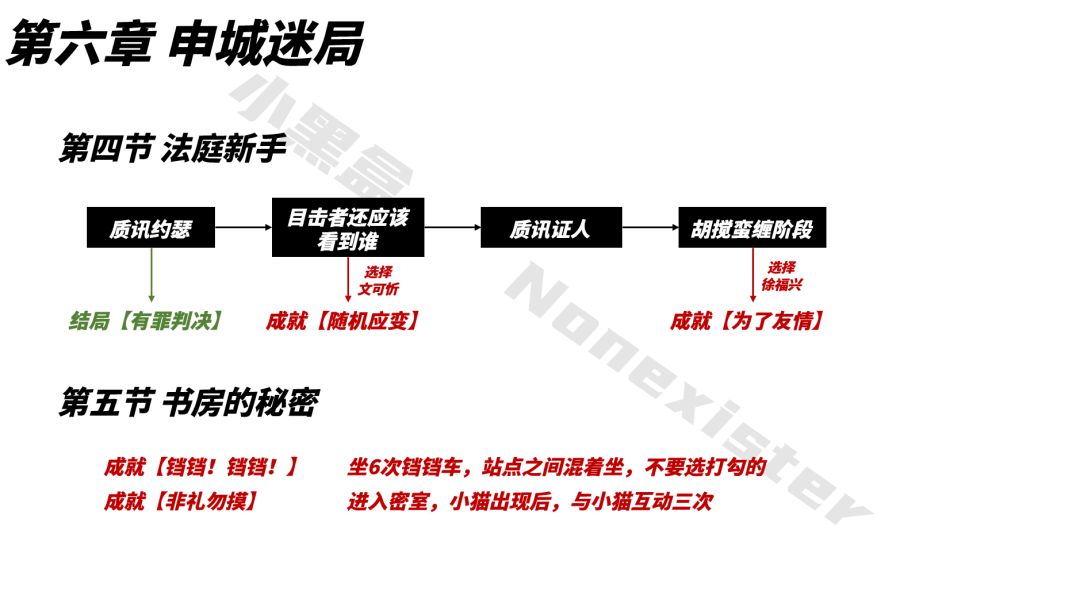 不管是先单独做成就,还是结局和收集品,都可能需要重复进入某个小节并推进剧情,直到需要的节点,这非常繁琐,笔者也是深受其苦。因此,第五章直接把所有可能遗漏的成就、结局、知识和史实都整合了进去,做成流程图的形式,旨在帮助想做全成就的玩家省时、高效地拿到全成就。
