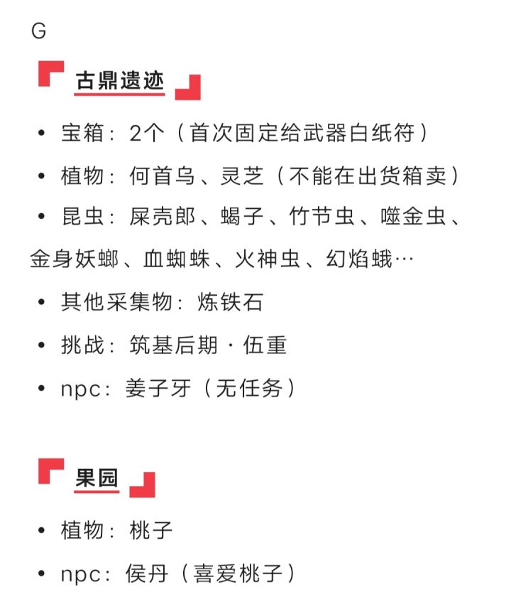 • 宝箱:共5个,露天3个下次进入会刷新。(2个在右侧偏上方树林的位置。另有一个宝箱比较隐蔽,在后厨建筑的背面,为视觉盲区,御剑飞行到后厨屋顶再降落才能看见)。两间屋内各1个(不刷新)