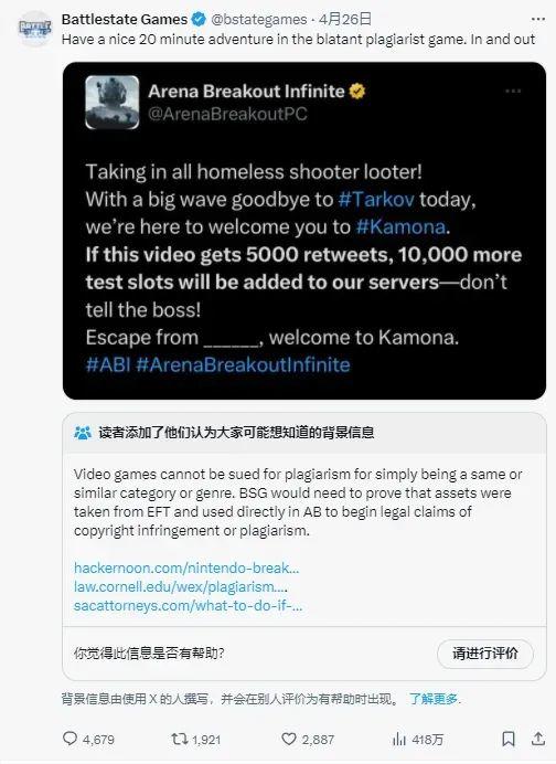 不过,看到这则消息,尼基塔终于坐不住了。他们开始寻求反击,很快就转发了《暗区突围》端游海外版的推文,并表示「这是一款公然抄袭的游戏,只配给它20分钟。」