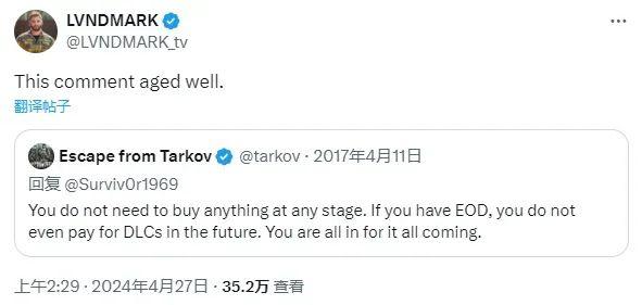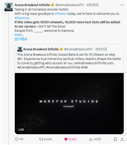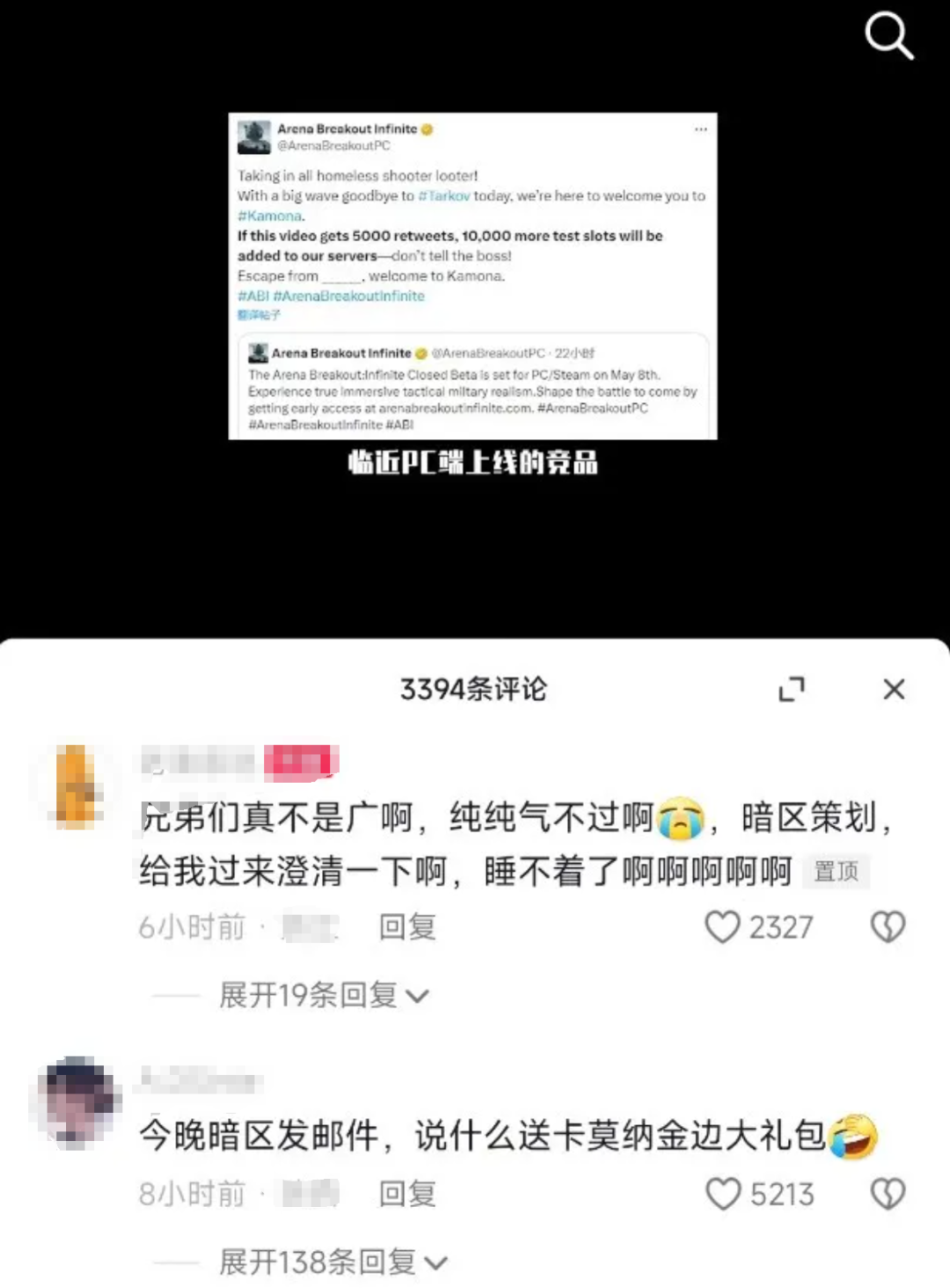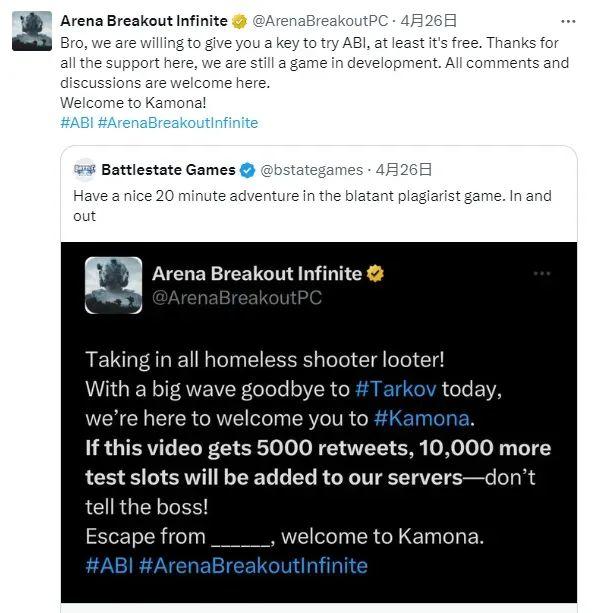 堪称绝杀的是,《暗区突围》端游海外版最后还高情商发文「感谢」《逃离塔科夫》,「兄弟,我们也可以给你发测试资格,至少这不要钱。不管怎么说,感谢你的支持……」