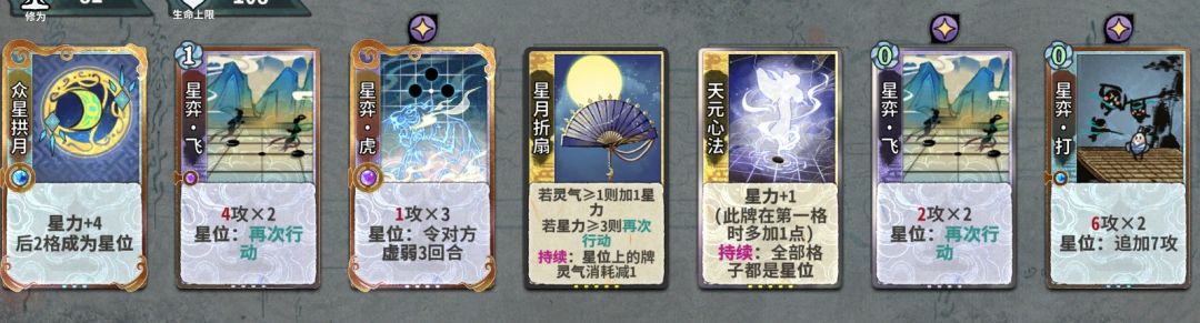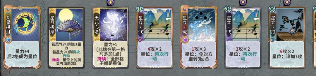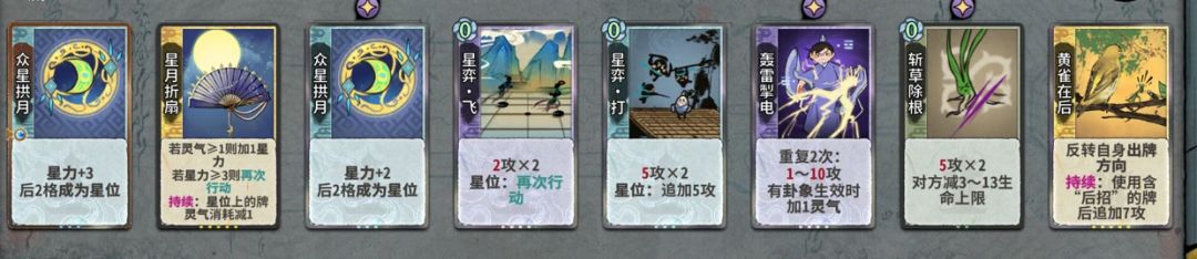 第11轮上化神,有一张众星就留算无,摆众星扇子X算无XXXX(多断伤害优先)。保持卡组最少7张牌D牌找天元心法,没天元前留一张黄雀在后放最后面,两众星就摆众星扇子众星XXXXX同上。有天元就根据几张星弈飞来摆多再动,这时候每轮都要算下修为判断先后手,有天元后星弈飞才是最关键的,能加快运转速度。