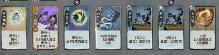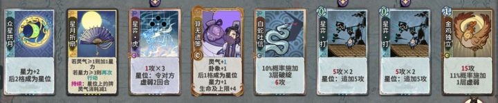 金丹元婴期的摆位:1号位一般是灵气星力或消耗牌,2号位算无,星位上多段伤害,中间穿插白蛇接输出很好用。