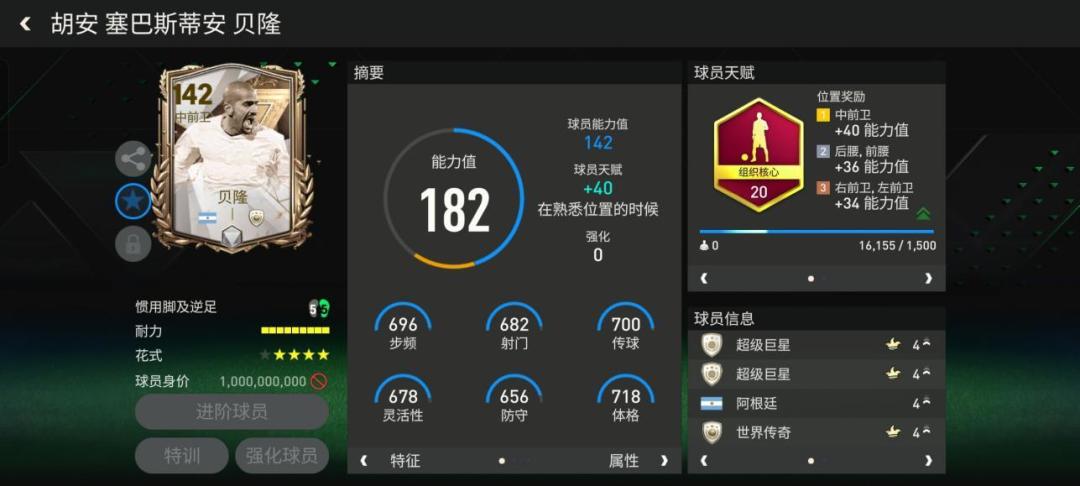 数据方面,贝隆的基础能力值达到142,搭配了组织核心天赋,加强了他短传、长传、视野、盘带、反应5项重要数据,提升了他在中场的盘带摆脱能力。