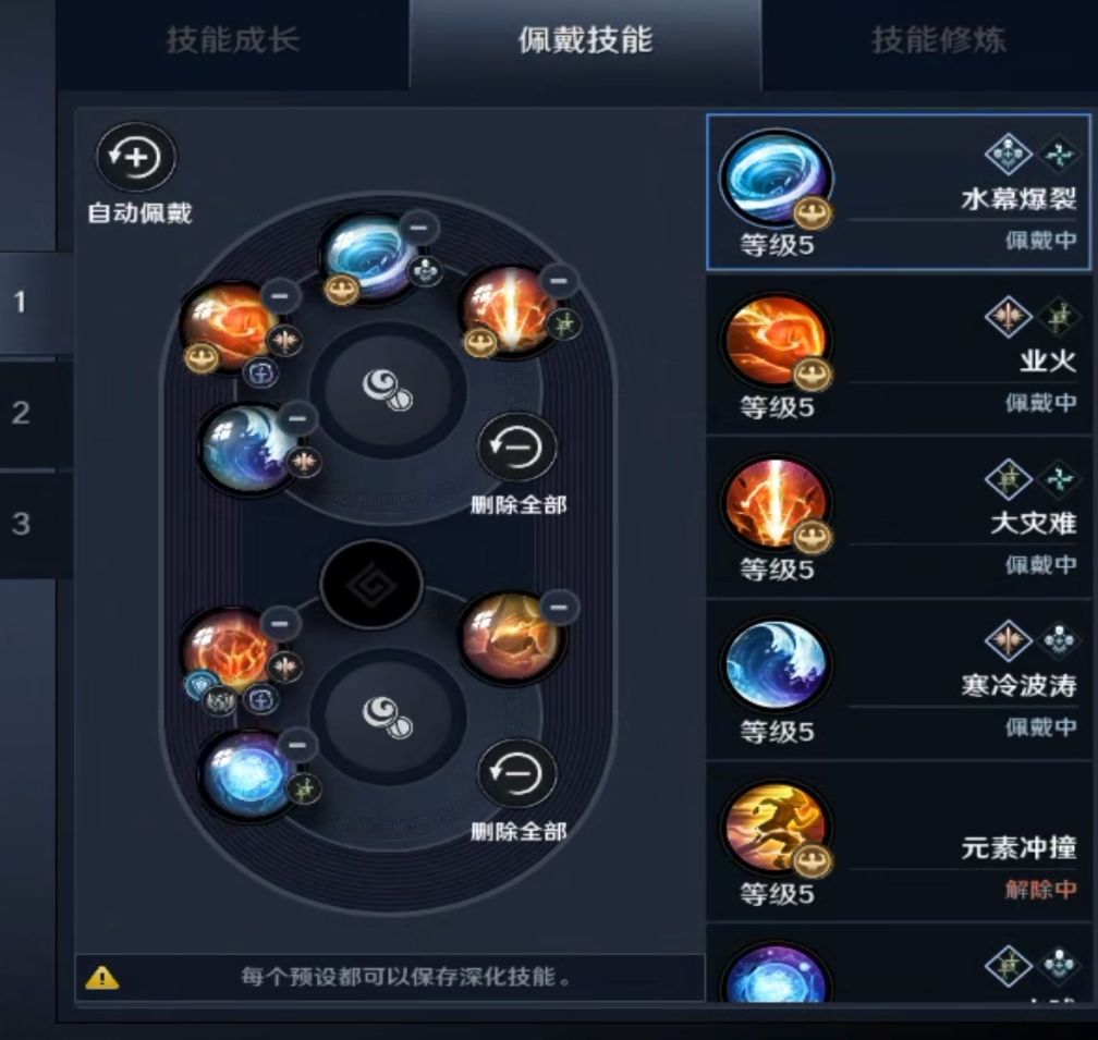 如果嫌施法慢,可以关闭技能深化,多佩戴一个【水的洗礼】技能