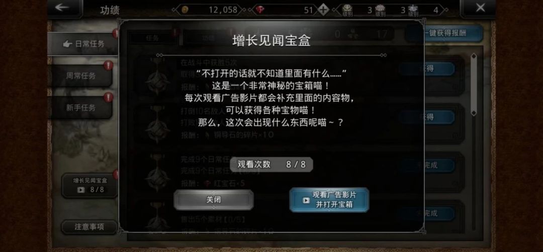 另一方面,从目前的运营版本来看,游戏中加入的福利足以支撑“零氪”玩家获得优秀的游戏体验,除了每天上线获得的奖励之外,游戏中还加入了“看视频”获得奖励的机制,每天8个视频,可以获得大量游戏中的金币。