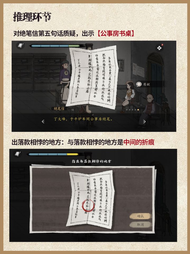 进入推理环节⬇1.对绝笔信第五句质疑,出示【公事房书桌】