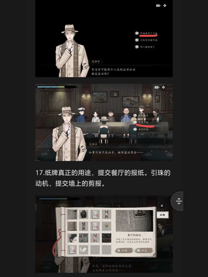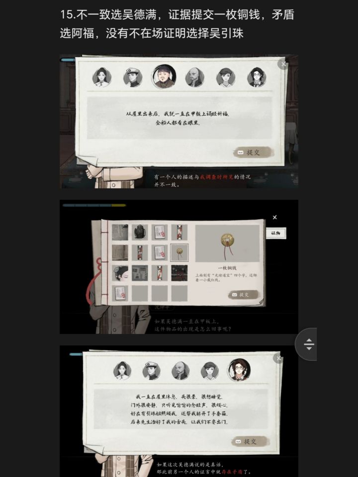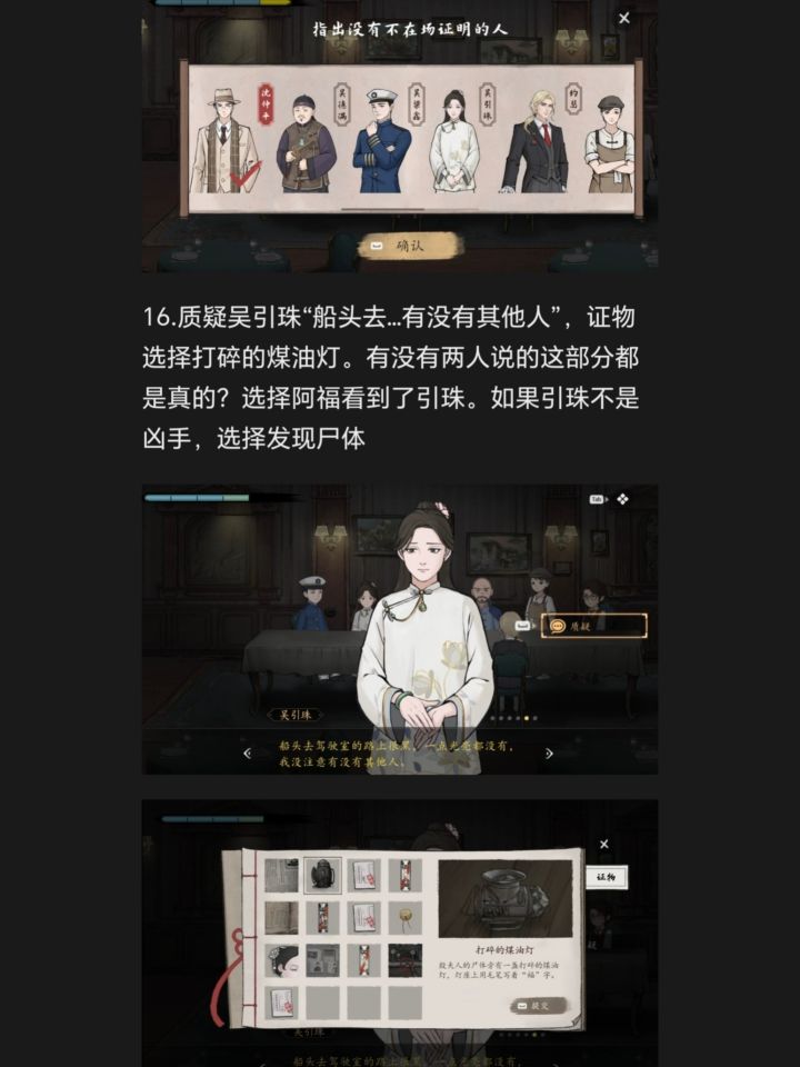 16.质疑吴引珠“船头去有没有其他人”,证物选择打碎的煤油灯。有没有两人说的这部分都是真的?选择阿福看到了引珠。如果引珠不是凶手,选择发现尸体