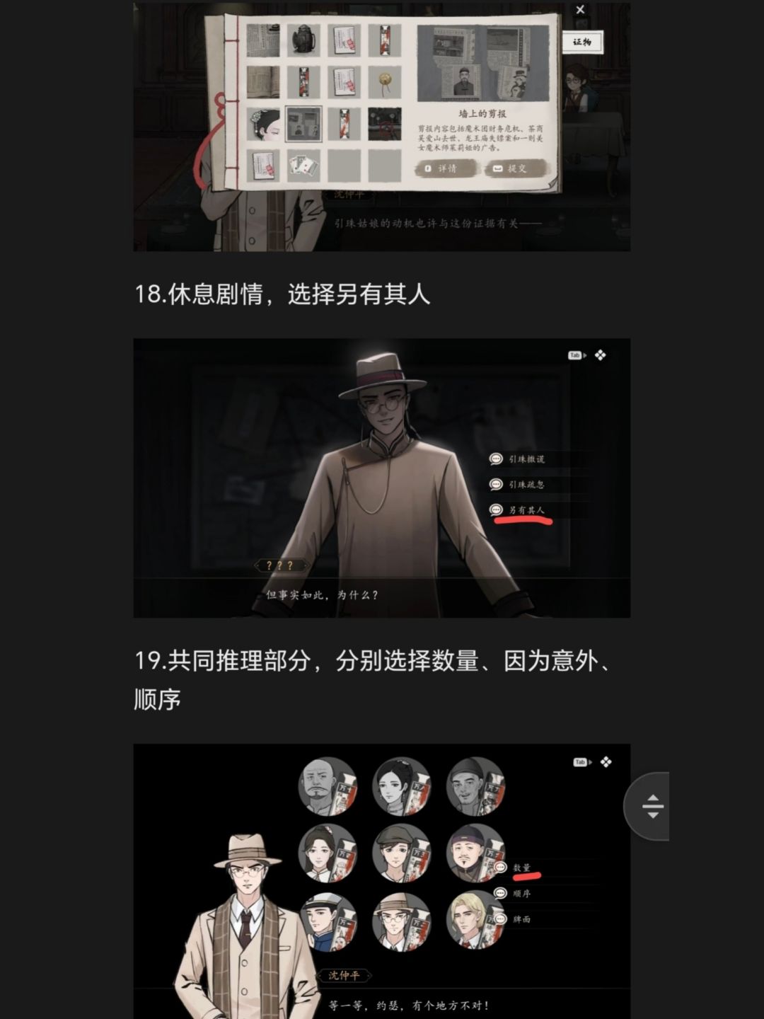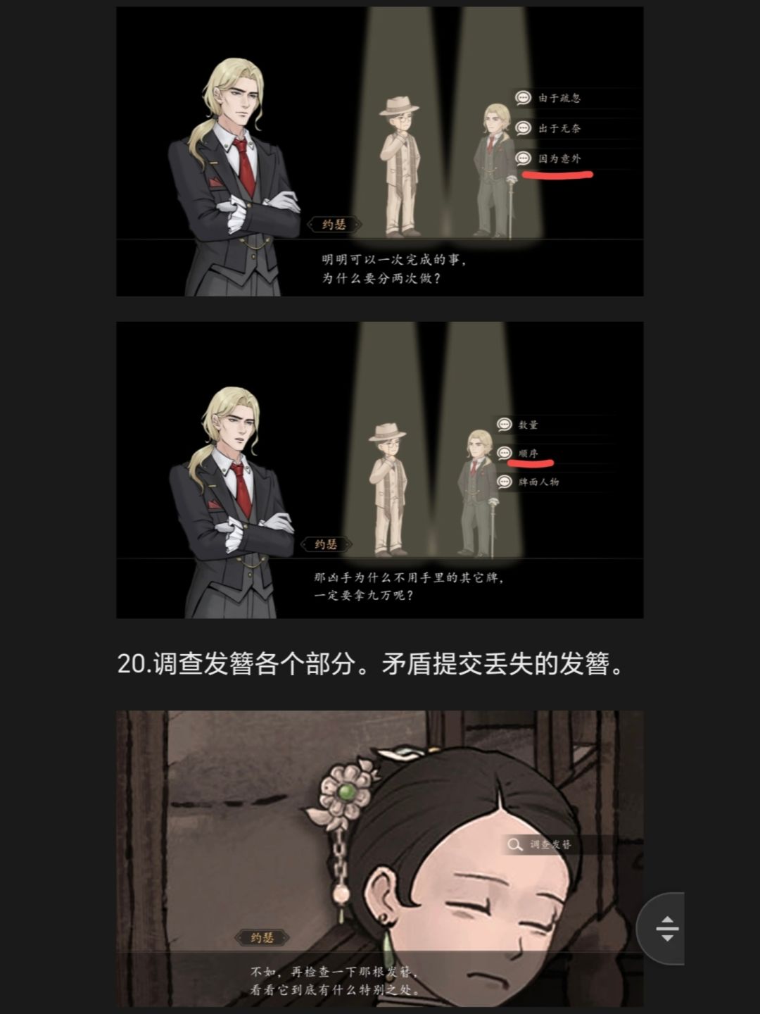 19.共同推理部分,分别选择数量、因为意外、顺序20.调查发簪各个部分。矛盾提交丢失的发簪。