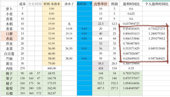 能够看出加上浇水效果后,部分农作物的盈利时间比的比值高于水果的比值。
