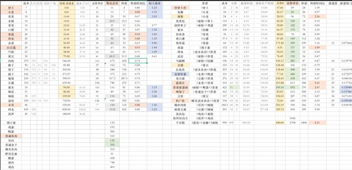 参考@雨正 大大,进一步整出来的表格,主要是菜谱那块的时间加上农作物生产时间。