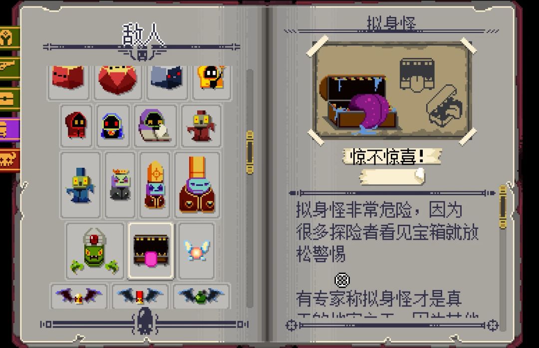 每一层都有两个宝箱房,一个装武器,一个装道具。宝箱越华丽,内容物等级越高。有的宝箱是宝箱怪,识别宝箱怪的方法有如下几种,开枪打一枪,会变身反击。观察宝箱的嘴,宝箱怪的嘴会轻微蠕动,如果你使用的是猎人,猎人的狗见到宝箱怪会叫。对宝箱怪使用钥匙,同样会消耗钥匙,还会遭到宝箱怪的攻击。