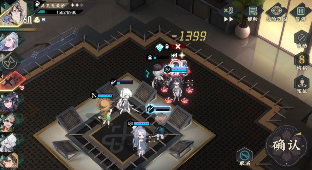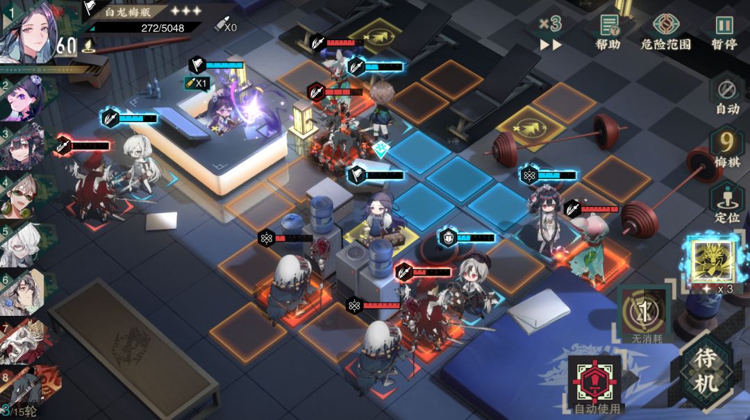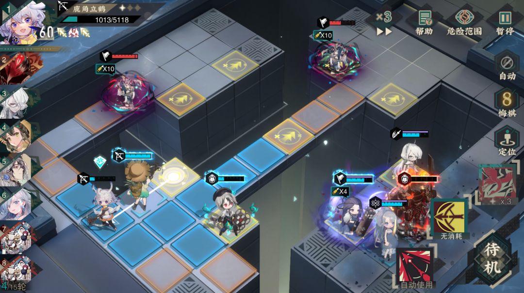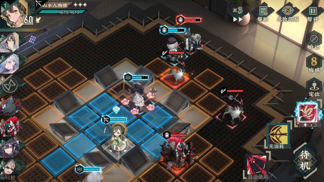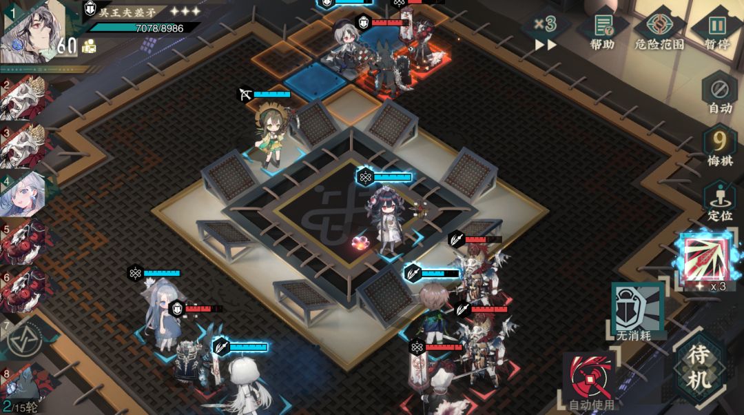 本关要尽可能利用强化地区提升攻击力。开局站位如下,我方轻锐和奶妈放置在炽刹君身侧,我方宿卫放置在中间抗另一个敌方宿卫伤害。第一回合白龙梅瓶直接靠近敌方远击开炮,这样她被炽刹君带走后能连续开两炮,其他角色优先击杀左下角和炽刹君身侧的远击。