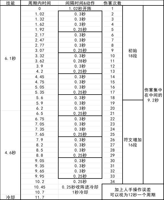 - 18段伤害并非均匀0.3秒分布在6.1秒持续时间之中,具体稍后在符文区一并展示。