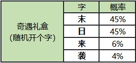 活动期间可免费领取奇遇礼盒2个,领取挂机奖励也可以获得奇遇礼盒(每4小时产出1个奇遇礼盒),使用单个奇遇礼盒可获得随机的字符(末、日、来、袭4个不同字体之一)