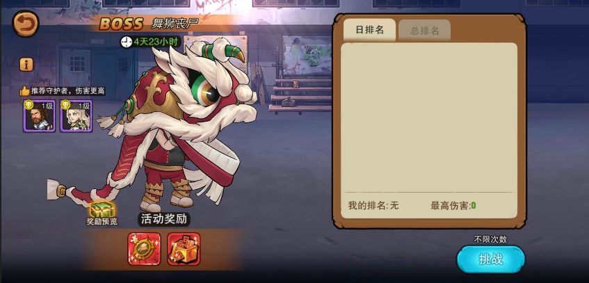 每日挑战BOSS舞狮丧尸打出最高伤害会计入日排行中(挑战次数不限),按每日排行名次发放相应的每日伤害奖励(内含高级招募券、奇遇礼盒),活动结束后会发放最终总伤害排名奖励(内含辰龙的愤怒·碎片、奇遇礼盒、子弹)