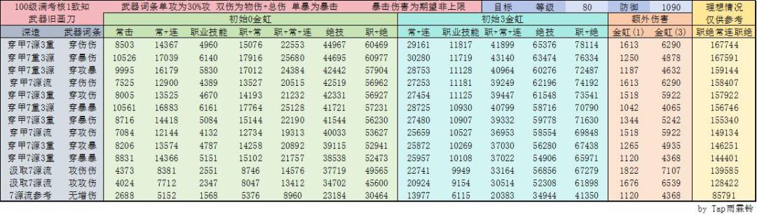 和我预想的差不多,原本猜想就是不要暴击的穿伤伤(第一行)是伤害最高的,毕竟这个点法吃满了金虹(若无额外说明本文的“金虹”单指对金虹乍现下目标造成伤害时追加的 额外物理伤害)同时也没舍弃太多的直伤;