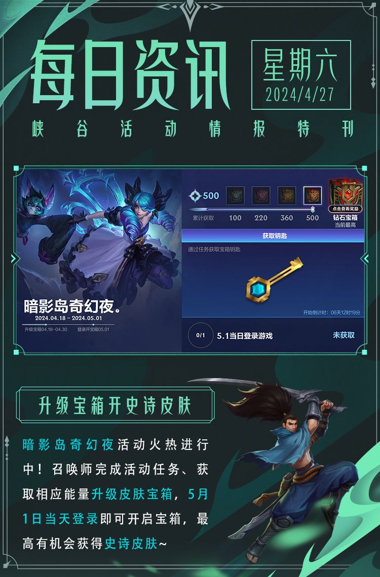 升级宝箱领免费皮肤,距离宝箱开启仅剩3天!截止至5月1日,召唤师完成活动任务,即可获取相应能量升级皮肤宝箱~5月1日当天登录还可开启宝箱,最高有机会获得史诗皮肤!