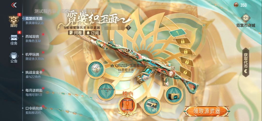 哈喽各位CFer大家好啊~霓裳舞胡旋,玉面羞花颜,此诗为谁言,玉凝笑开颜。新版本霓裳织玉面活动已经上线了,通过完成每日、每周以及挑战任务获得霓裳币便可通过五轮抽奖抽到QBZ03-玉面羞花的觉醒石从而觉醒。霓裳织玉面活动还拥有兑换商城,王者之骰、赏金令积分和M4A1-死神-机甲核心皮肤等等都在里面可以免费获取,接下来跟随我一块来看看吧。