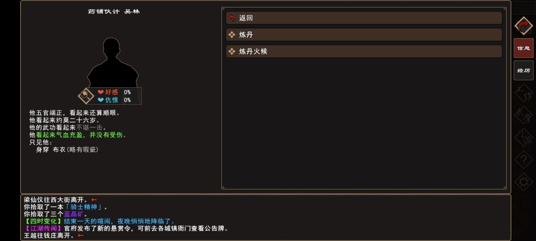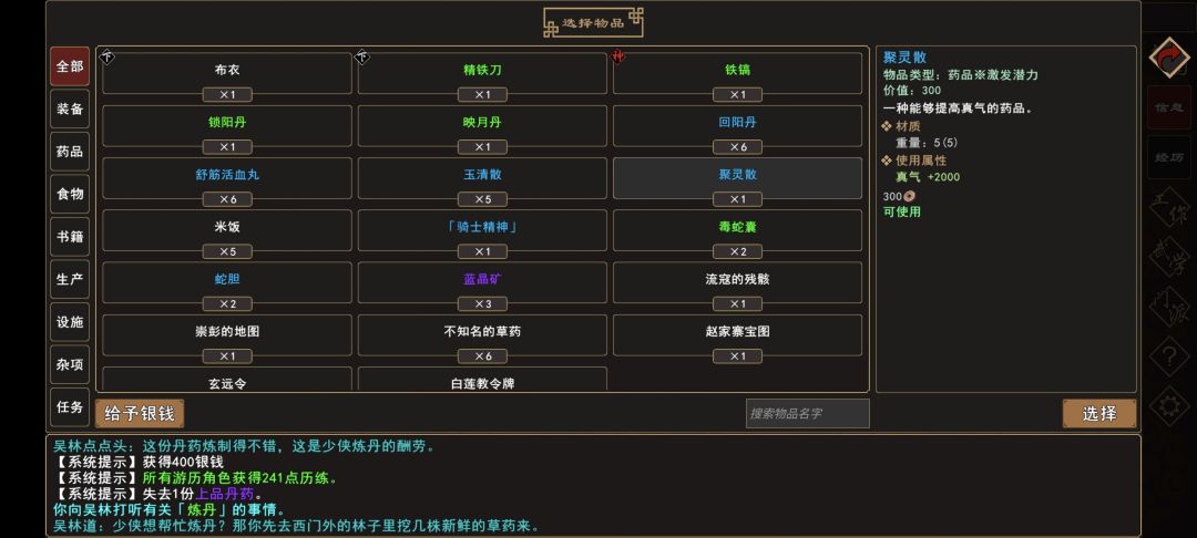 (5)[人物:药铺伙计 吴林]对话 选择给予[普通丹药]/[上品丹药],完成任务;给予[普通丹药]获得:①[银钱]×150,②全队历练 100+,③小概率获得[聚灵散]和其他药品;给予[上品丹药]获得:①[银钱]×400,②全队历练 200+,③小概率获得[聚灵散]和其他药品。